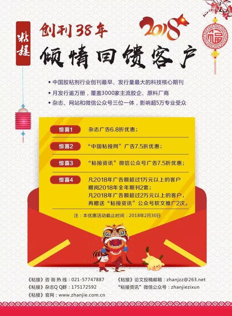 弹指间,《粘接》已陪伴胶粘剂行业走过38个春秋,得到了众多胶粘剂行业科技工作者、专家和企业的关注和支持。值此2018年新春即将来临之际,《粘接》决定倾情回馈广大客户,进行大力度的广告促销活动,详情如下: