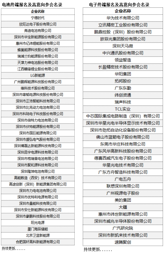本活动一经推出,即在行业内引起高度关注,众多名企名校资深专家确认演讲发言,尤其是受到众多电池、电子制造巨头名企的欢迎,在深圳市电池行业协会、广东省电子信息行业协会两大协会的鼎力支持下,以下电池和电子终端用胶企业已报名及高意向参会,具体名录如下: