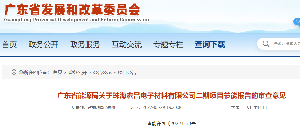 近日,广东省能源局发布了关于珠海宏昌电子材料有限公司二期项目节能报告的审查意见: