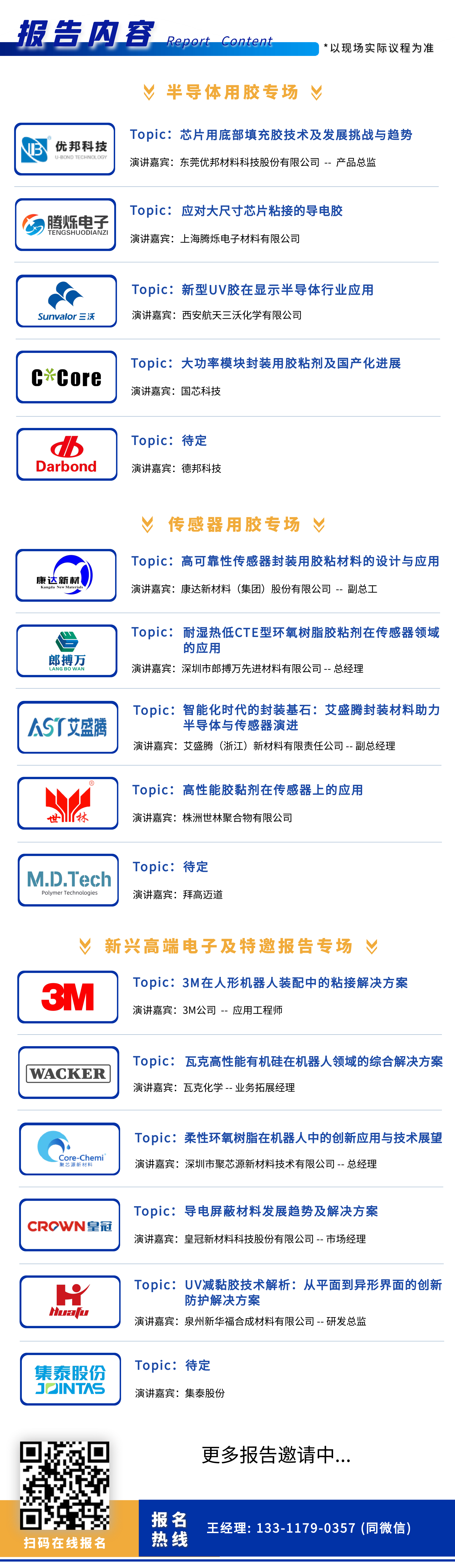本次论坛将重点围绕半导体、传感器、机器人、低空经济等新兴高端电子用胶方向邀请报告,欢迎从事相关研究的企业和院校、机构踊跃联系报告演讲,报告发言联系方式:张老师 136671899191(同微)。首批报告如下: