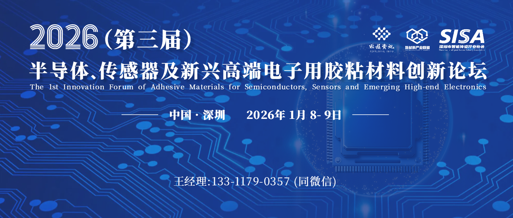 为推进胶企精准把脉中国半导体、传感器等新兴高端电子用胶市场与技术最新发展趋势,助推中国高端电子用胶产业快速高质发展,在2023年、2024年连续成功举办二届“半导体及高端电子用胶粘材料创新论坛”的基础上,粘接资讯、新材料产业联盟、深圳市智能传感行业协会等单位特于2026年1月8日-9日在深圳举办“2026(第三届)半导体、传感器及新兴高端电子用胶粘材料创新论坛”。
