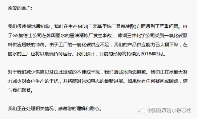 3)GS加德士公司在韩国丽水的重油精炼厂发生事故,锦湖三井化学公司受到一氧化碳原料供应短缺的冲击,MDI供应能力已大幅下降,在丽水的工厂也将以最低负荷运行。预计将持续到2018年3月。